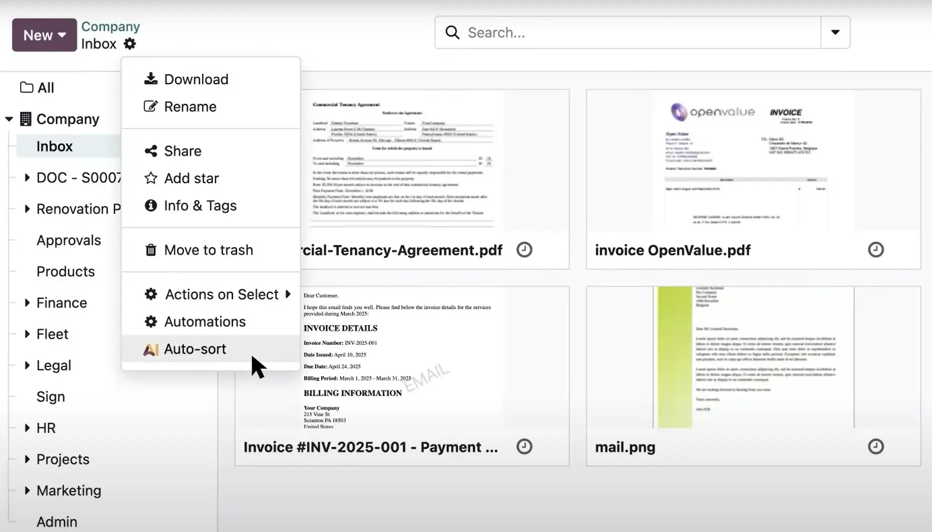 - Classement automatique (ex. factures fournisseurs) et digitisation IA : capture des données de PDF/images → création de factures, dépenses, tâches… par flux.