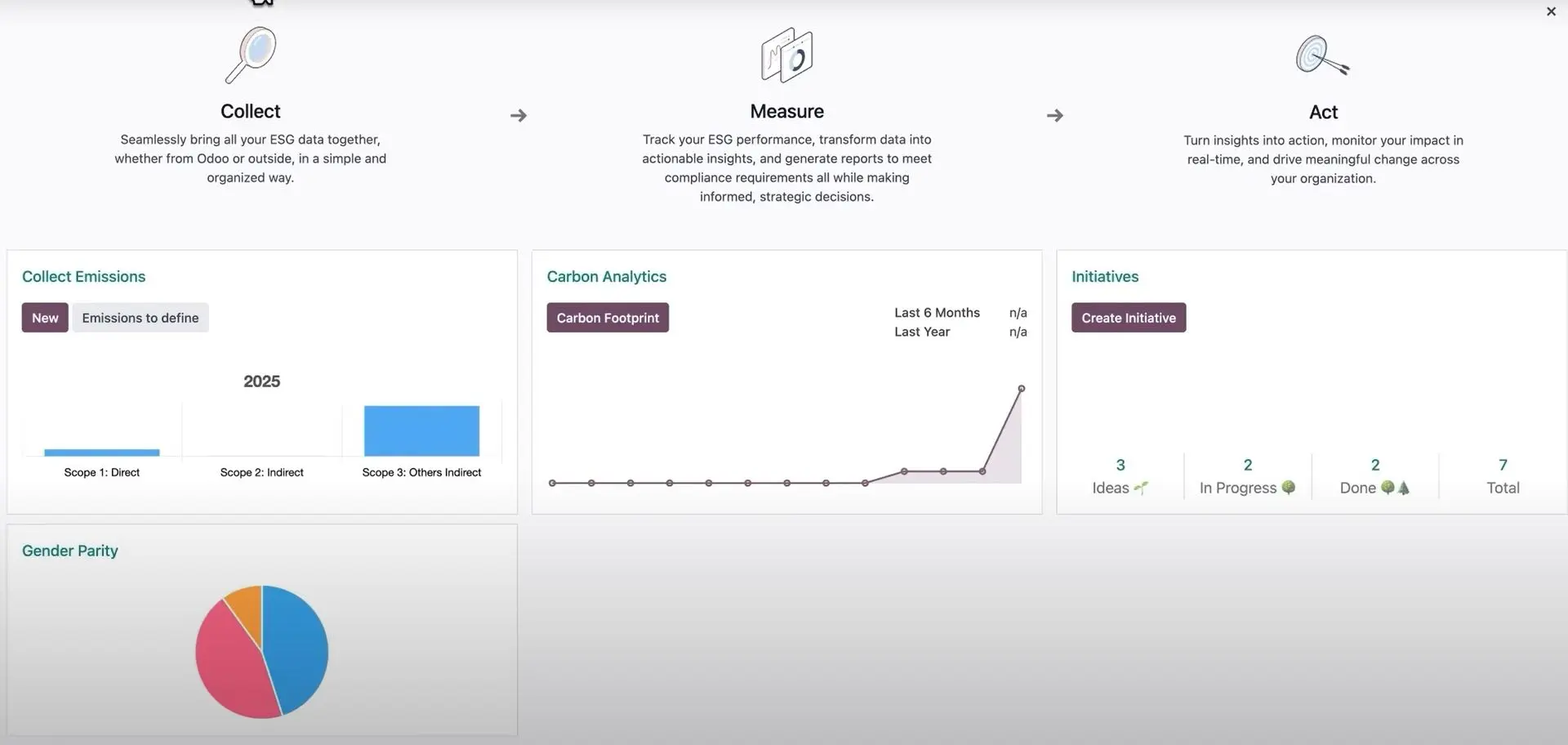 Grande nouveauté d’Odoo 19, l’arrivée de l’app ESG (Environnement, Social et Gouvernance) qui permet de :